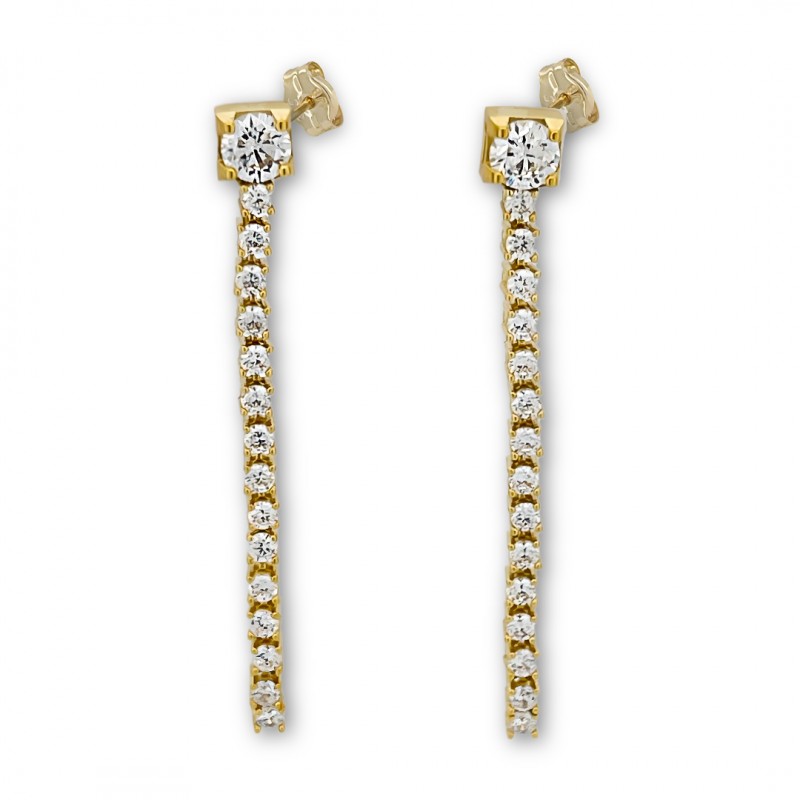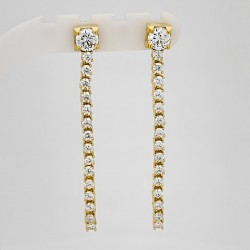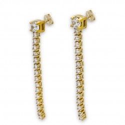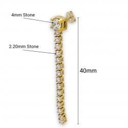 Diese atemberaubenden, langen goldenen Tennis-Ohrringe sind mit einer schillernden Reihe von Zirkonia-Steinen auf maximale Brillanz ausgelegt. Ein Statement-Stück für formelle Anlässe.