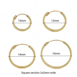 Ein stilvolles Set von Creolen mit einem quadratischen Querschnitt von 2x2mm Breite. Erhältlich in den Größen 10mm, 12mm, 14mm und 16mm, perfekt für Liebhaber eines minimalistischen Looks mit einem einzigartigen Touch. Ideal für den täglichen Gebrauch oder zwanglose Anlässe.