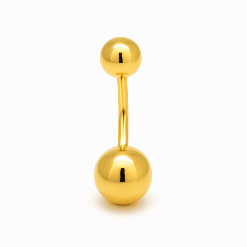 Bauchnabelpiercing mit Doppelkugel und Gewinde für sicheren Verschluss. Echt Gelbgold, bequemer, gebogener Stab.