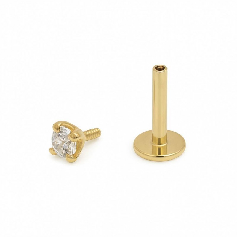 Dieser Labret-Ohrstecker aus Gelbgold mit einem 3 mm großen Zirkonia ist eine funkelnde Wahl für Frauen und Kinder. Das hypoallergene und polierte Design sorgt für sicheres Tragen bei empfindlicher Haut. Es eignet sich für Ohr-, Lippen- oder Gesichtspiercings und ist eine vielseitige und beliebte Wahl für B2B-Schmuckgroßhändler.
