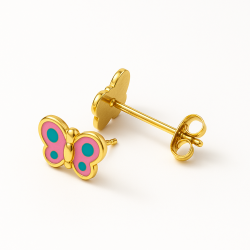 These charming butterfly earrings symbolise joy and growth. Crafted in yellow gold with pink and turquoise enamel wings, they’re hypoallergenic, playful, and perfect for girls’ daily wear or special occasions.