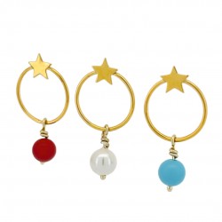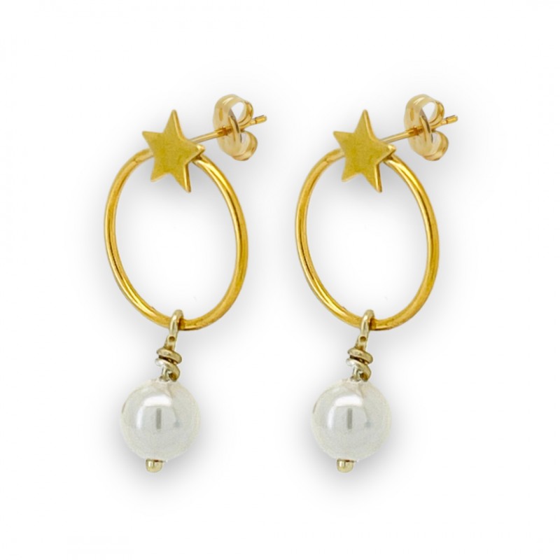 These gold star charm hoop earrings with a pearl drop are a perfect blend of celestial beauty and timeless elegance. Lightweight and hypoallergenic for daily wear.