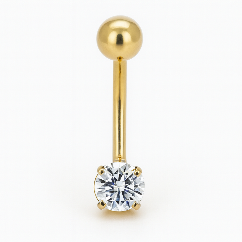 Four-prong 6mm round CZ offers classic brilliance in Real gold. Curved bar 1.20mm with polished top ball for durable daily wear.