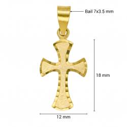 Product description:A satin-engraved ornamental yellow gold cross with distinctive carved motifs, offering a sophisticated faith symbol for both daily use and special religious moments.Product Attributes:• Main Material: Real yellow gold (available 9K/10K/14K/18K)• Style: Satin-engraved ornamental cross• Target: Women, men, girls, unisex• Usage: Daily wear, gifts, communions, religious occasions• Finish: Satin & polished dual finish• Dimensions: 18 × 12mm• Bail: 7×3.5mmLog in to see approximate prices.