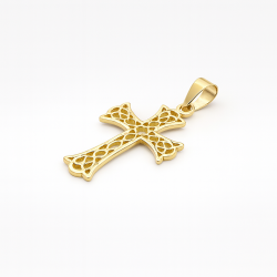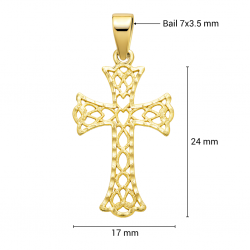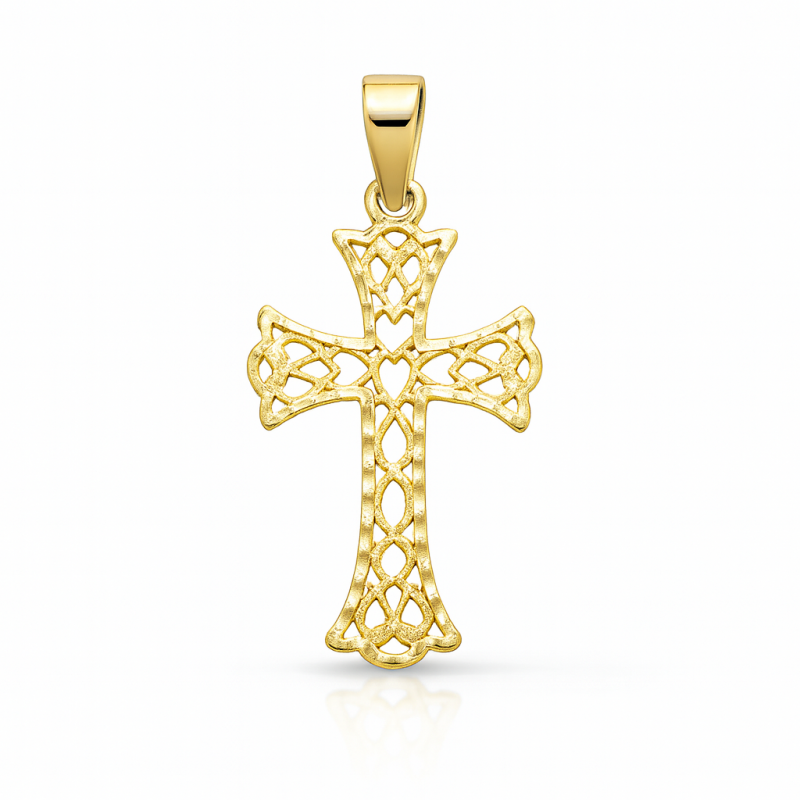 Product description: A unique filigree cross pendant embellished with subtle heart motifs. Crafted in real yellow gold, it offers a blend of warmth, symbolism and hand-carved detailing. Ideal for customers seeking feminine, meaningful fine jewellery.Product Attributes:• Main Material available: 9k, 10k, 14k, and 18k• Style: Filigree heart motif, carved• Target: Women, Girls, Unisex• Usage: Daily wear, gifts, communions, religious events• Design: Heart-inspired openwork carving• Dimensions: 24 × 17 mm• Bail: 7×3.5 mmLog in to see approximate prices.