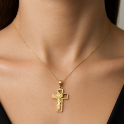 Product description: This elegant yellow solid gold pendant features a finely carved representation of Jesus integrated into a cut out cross design. Lightweight yet detailed, it offers a refined symbol of faith ideal for daily wear, meaningful gifts and religious celebrations.Product Attributes: