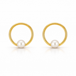 Yellow gold open-hoop studs with a luminous freshwater pearl (3–5 mm). Modern minimalism meets timeless elegance.