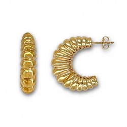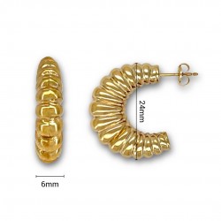 Estos elegantes aretes tipo argolla de oro de 14k presentan un diseño texturizado acanalado con un diámetro de 24 mm, perfectos para agregar un toque de sofisticación a cualquier atuendo.