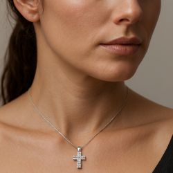 Descripción del producto:Elegante y radiante colgante de cruz de oro blanco auténtico, adornado con circonitas cúbicas de 1,25 mm engastadas a mano. Una refinada declaración de fe para mujeres que aman el lujo minimalista.Atributos del producto:• Material principal: Oro blanco macizo de 9 quilates, 10 quilates, 14 quilates y 18 quilates• Piedra: Circonita cúbica de 1,25 mm• Tamaños disponibles: 18 × 12 mm / 24 × 16 mm• Estilo: Clásico religioso• Acabado: Pulido intenso• Artesanía: Hecho a manoInicia sesión para ver precios aproximados.