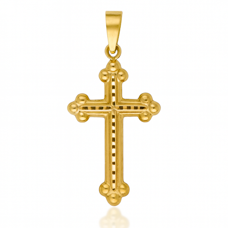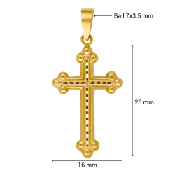 Este colgante de cruz ornamental con capullos, tallado en satén, presenta intrincados detalles de puntos a lo largo de los brazos centrales y terminales en forma de cuentas. Con un tamaño de 25 × 16 mm, combina tradición con textura artesanal, creando un colgante religioso unisex excepcional.