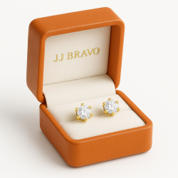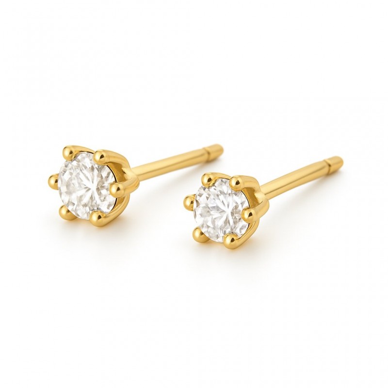 Pendientes de fundición de 6 garras con diamante de laboratorio de 3 mm (F-VS) en oro amarillo. Fabricados en España con oro macizo y diamantes cultivados en laboratorio. Perfectos para quienes buscan joyería elegante y ética. Acabado pulido, ideal para mujer y estilos unisex.