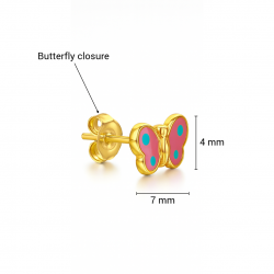 Estos encantadores aretes de mariposa simbolizan la alegría y el crecimiento. Elaborados en oro amarillo con alas de esmalte rosa y turquesa, son hipoalergénicos, divertidos y perfectos para el día a día de las niñas o para ocasiones especiales.