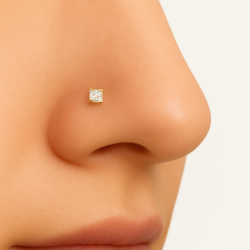 Moderno pendiente de nariz en oro de 14 quilates con una CZ de corte princesa en garras seguras. El pasador anatómico en L de 0,7 mm garantiza comodidad y sujeción. Diseñado para una venta segura en el surtido de joyería fina.Características del producto