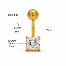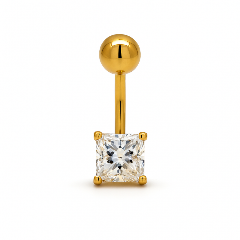 Este piercing para el ombligo de oro amarillo auténtico luce una impresionante circonita cúbica de corte princesa de 8x8 mm, que combina elegancia con un estilo audaz. Hipoalergénico y finamente pulido, garantiza comodidad y brillo para el día a día o para ocasiones especiales. Una opción premium para mujeres que buscan joyería corporal fina que combine lujo y precio asequible, ideal para compradores mayoristas que buscan un estilo vanguardista.Atributos del producto