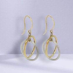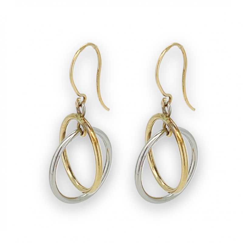 Modernos pendientes colgantes circulares de oro de dos tonos, elaborados para mujeres que buscan accesorios versátiles y livianos. Perfectos para el día a día o para ocasiones especiales.