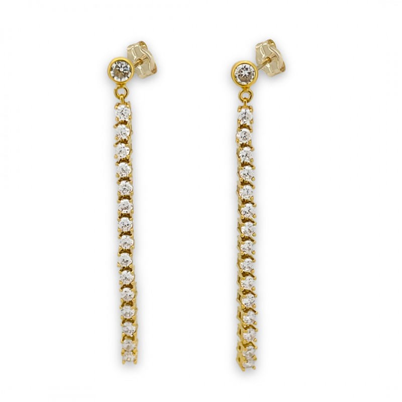 Estos glamurosos pendientes largos de oro con circonitas cúbicas ofrecen un look refinado y llamativo. Perfectos para bodas y ocasiones formales.