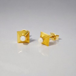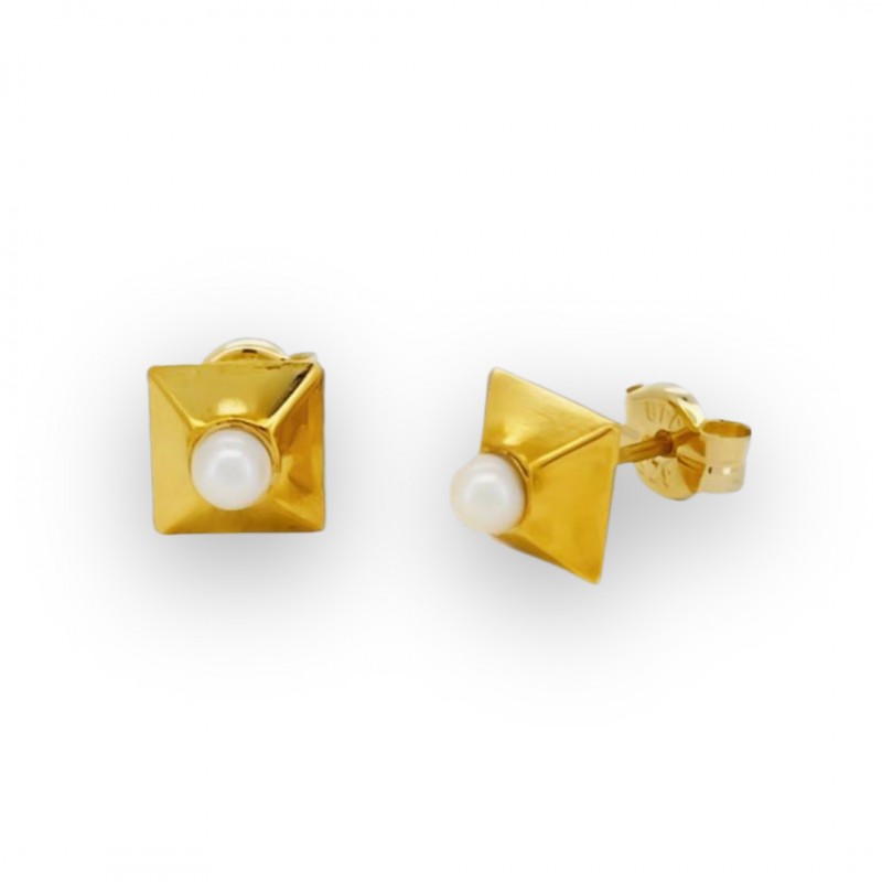 Estos pendientes piramidales de oro con un delicado detalle de perla combinan la geometría moderna con la elegancia clásica. Una opción refinada para el día a día.