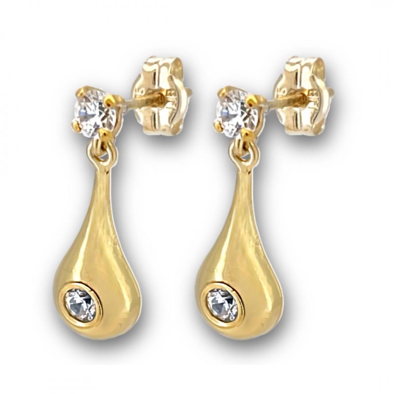 Elegantes aretes colgantes de oro amarillo adornados con circonitas de 3 mm y 2,5 mm, diseñados para darle un toque de lujo a cualquier atuendo sofisticado.